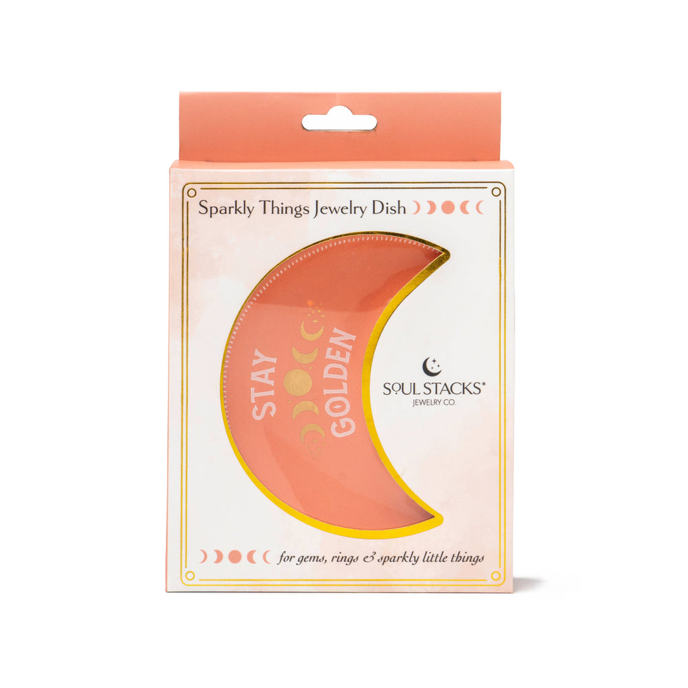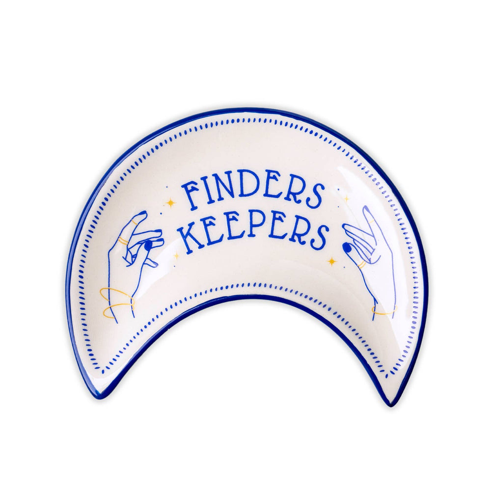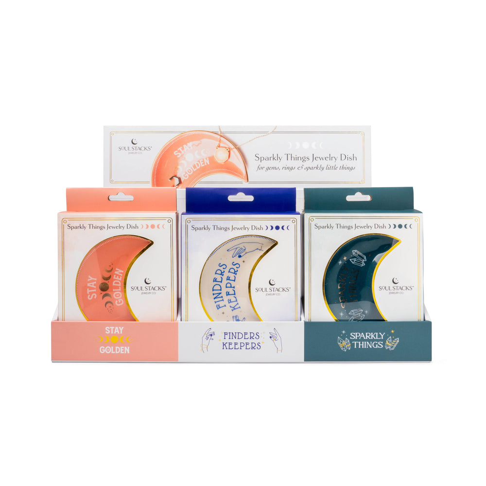 Keepsake all your sparkly little things from water, lost pairs and life altering drain scares. These ceramic dishes are in the shape of the crescent moon with mystical messages painted inside. Perfectly sized for gems, rings and sparkly little things. -Keep your most-worn jewelry safe and clean -Ceramic crescent moon shape -3 mystical styles: Stay Golden, Finders Keepers, Sparkly Things