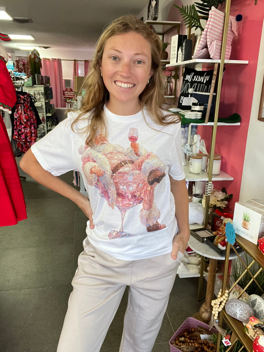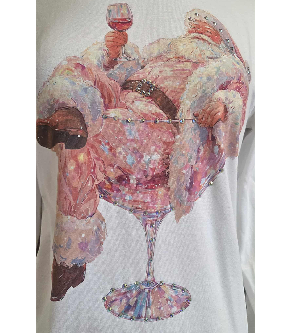 This playful holiday graphic tee features a relaxed Santa lounging in a sparkling cocktail glass while holding a festive drink.