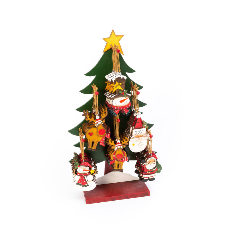 4.9"H Wood Holiday Ornament w/ Wooden Tree Display, 6 Asst