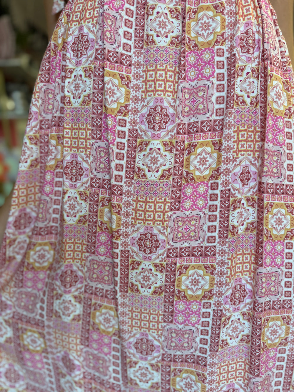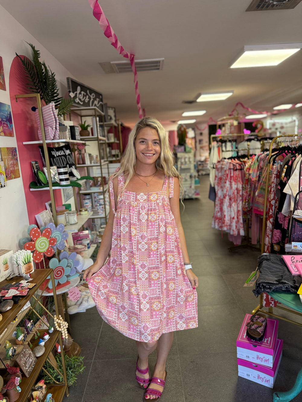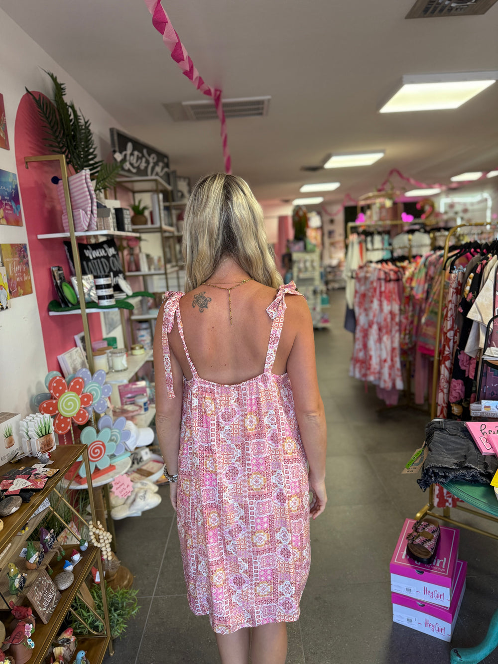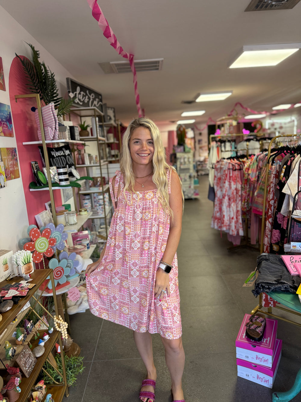 Brighten up your wardrobe with this playful printed mini dress featuring cheerful pink and orange hues that scream sunshine fun! Designed with adjustable tie straps and tassel detailing for that perfect boho-chic vibe, this dress is as easy to wear as it is to love.