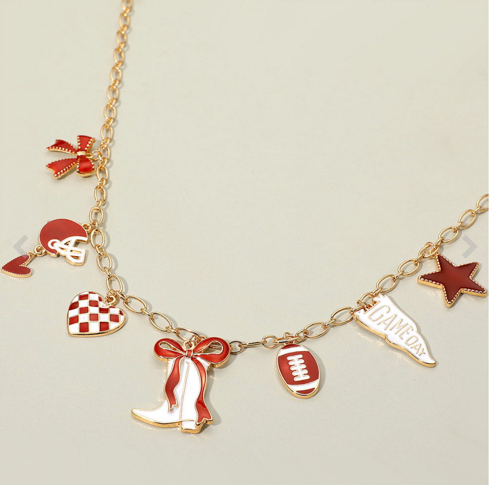Bring the perfect blend of team spirit and playful charm to your next football game day with this adorably bold statement necklace! Designed for fans who love a little flair with their football, this eye-catching accessory features a whimsical mix of miniature football helmets, coquette bows, checkered hearts, football charms.