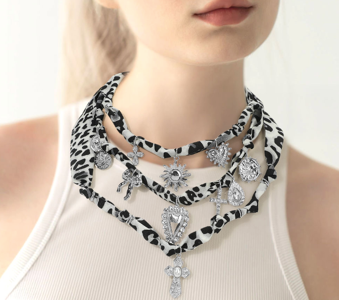 • Make a bold impression with this layered necklace featuring mixed symbolic charms and a standout leopard-print wrap. Its multi-strand design combines boho flair with statement elegance, perfect for elevating any look with confidence and style.