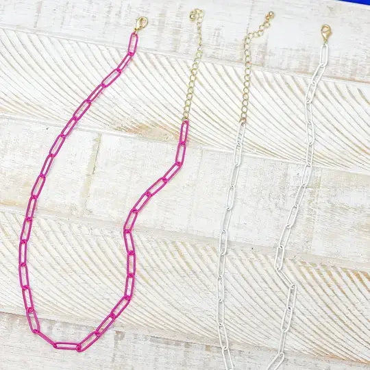 Discover the perfect addition to your jewelry collection with the Enamel Paperclip Chain Necklace by Prep Obsessed Wholesale. This unique piece is designed with a 16" chain, plus a 3" extender for adjustable length. Crafted with care and precision, this necklace upholds the high standards of Prep Obsessed. It's more than just a necklace, it's a statement of style and sophistication.