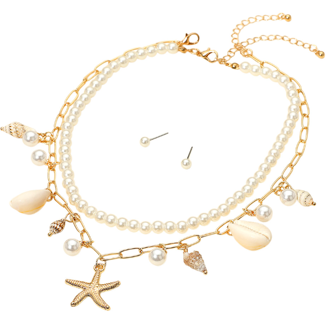 • Two separate necklaces featuring a shell charm chain and a classic pearl strand. This versatile beach-inspired set includes matching stud earrings, perfect for mixing, layering, or wearing individually.