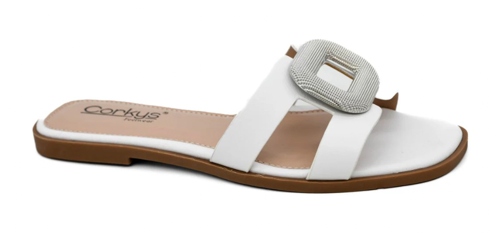 An everyday sandal by Corky's is an essential in every closet! This pair is a versatile style with a white sandal and silver pendant detailing. They are a flat sandal, but still have the Corky comfort you know and love.