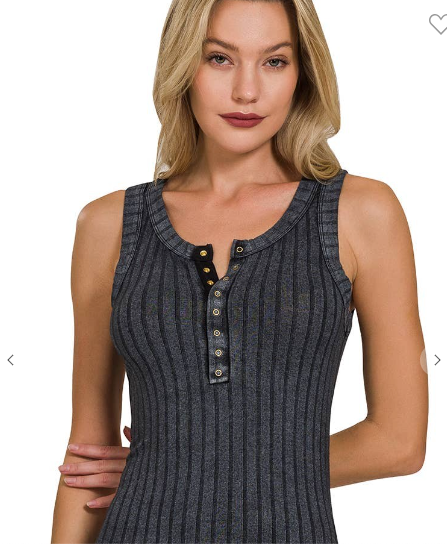 Sleek, soft, and effortlessly cool — this ash black ribbed tank features a flattering scoop neck and front button-up detail for a touch of edge. The stretchy ribbed fabric hugs in all the right places, making it perfect for layering or wearing solo.