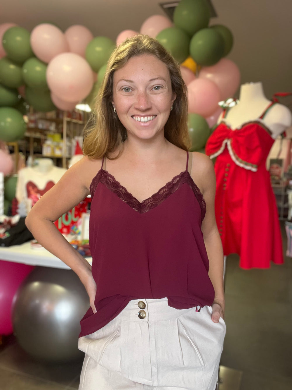Cami With Lace Trim Delicate lace trim adds a feminine accent Sleek cami silhouette with a soft drape Effortless piece for layering or wearing solo Fabric: Woven 100% POLYESTER Hand Wash Cold