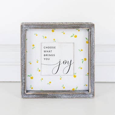 Be inspired by Adams & Co's wood frame sign! This wood frame sign (Product Number 1117) bears the "Choose What Brings You Joy" message and is 8" wide, 8" high, and 1.5" thick. Using different colors including white, yellow, green, and black, this wood frame sign would match well with your other Everyday accessories. Designing home and holiday decors since 22, Adams & Co has shown the world its unique style and conventional flair that can bring you any home or office theme that you want to achieve.