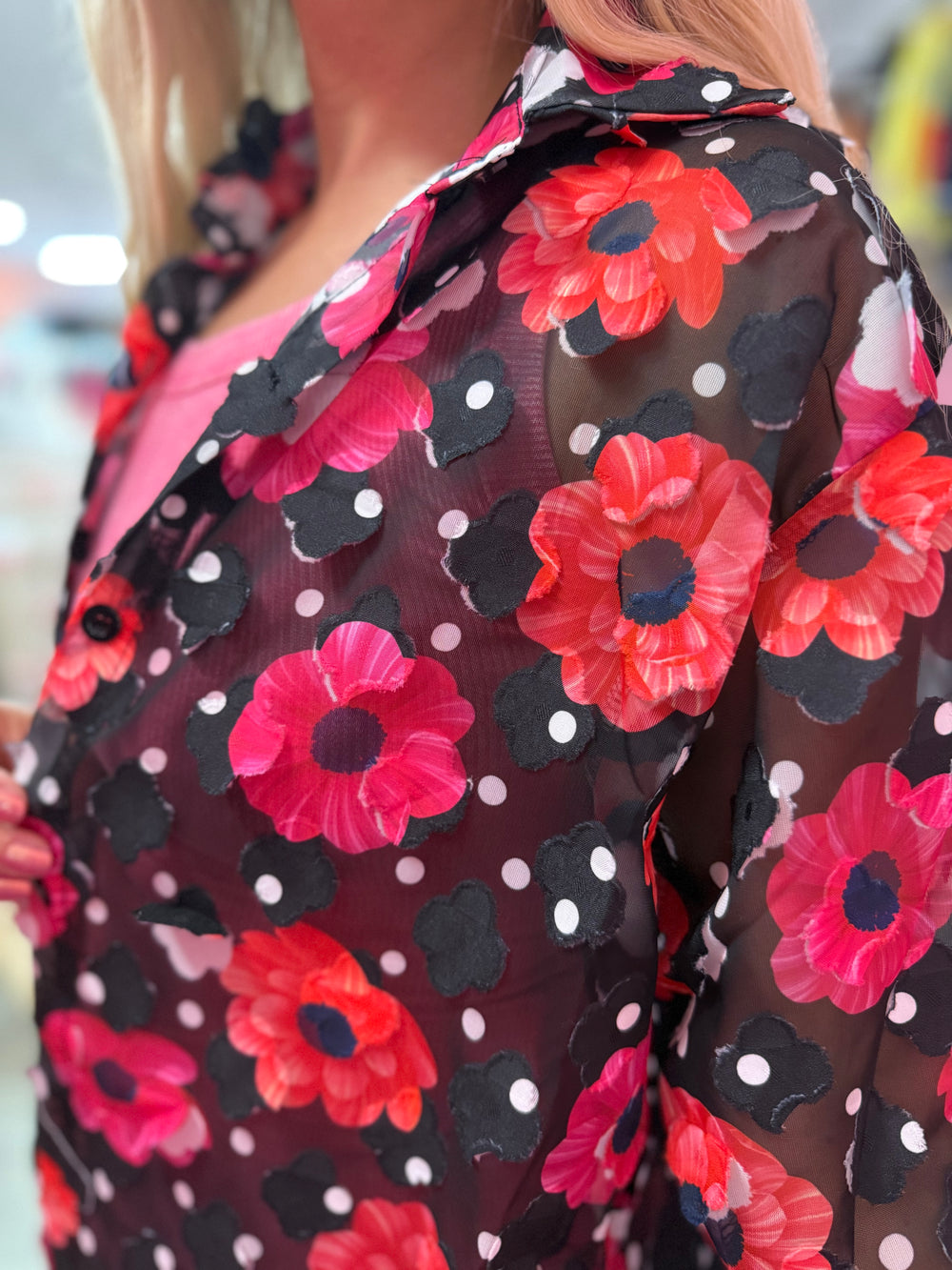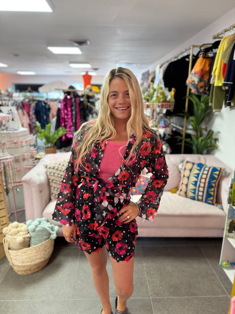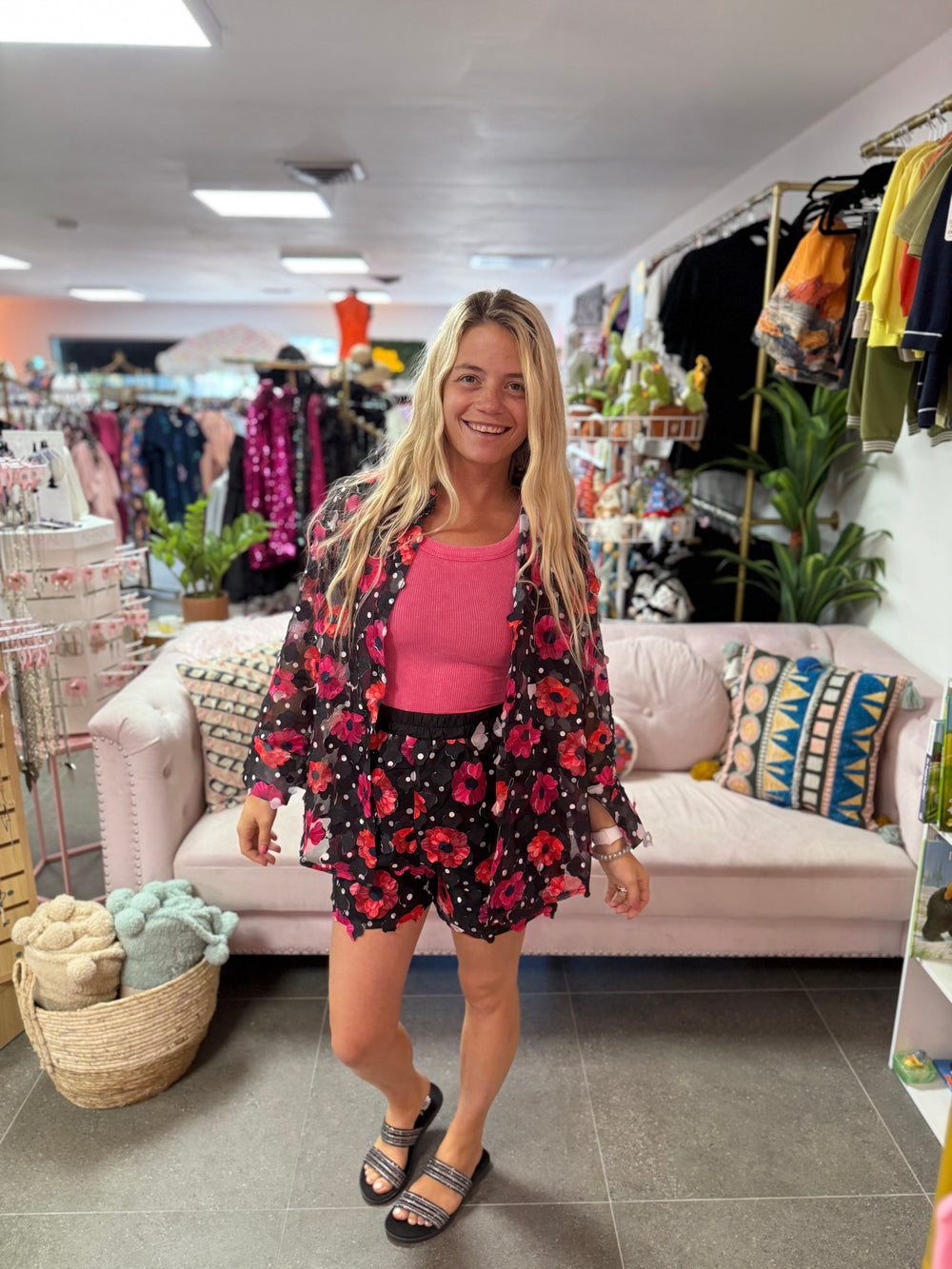Let’s get beachy with this two piece set! She’s part glam, part resort, & part fun. But most importantly, she’s guaranteed to keep you feeling cool while looking HOT! With its multi-purpose wear you can style open over a bathing suit, closed for a dinner date, or even separate the pieces for a completely new world of looks. Features: 3D pop flower ruffles, sheer top with fully lined bottoms, pockets, functional buttons, long sleeve with roll up capabilities, non stretch with a loose fit, & an elastic waistband on the shorts!