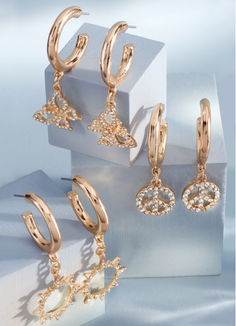 Elegantly crafted exquisite dangling post back earrings with three beautiful charms in a high shine metal, a star, a butterfly and peace symbol all encrusted with faceted crystals creating tons of sparkles for the perfect look for the woman on the go. All protected with an essential long lasting tarnish resistant finish to make a beautiful timeless classic. Available in Gold and Silver. 100% Iron. Keep jewelry clean store separately in a soft pouch.