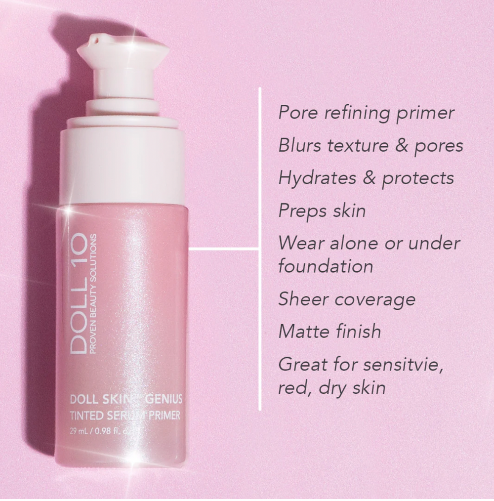 A tinted primer that does it all! Our revolutionary Doll Skin Genius Tinted Serum Primer preps skin for makeup, blurs texture & pores, and provides instant coverage - all while energizing your skin cells to repair and defend against aggressors. Clean, Vegan, Hypoallergenic, Cruelty-free, Weightless & Oil-free.