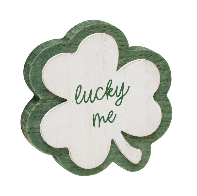 Green Washed Wood Clover Cutout with 3D White Washed Wood Layer and Green Text.