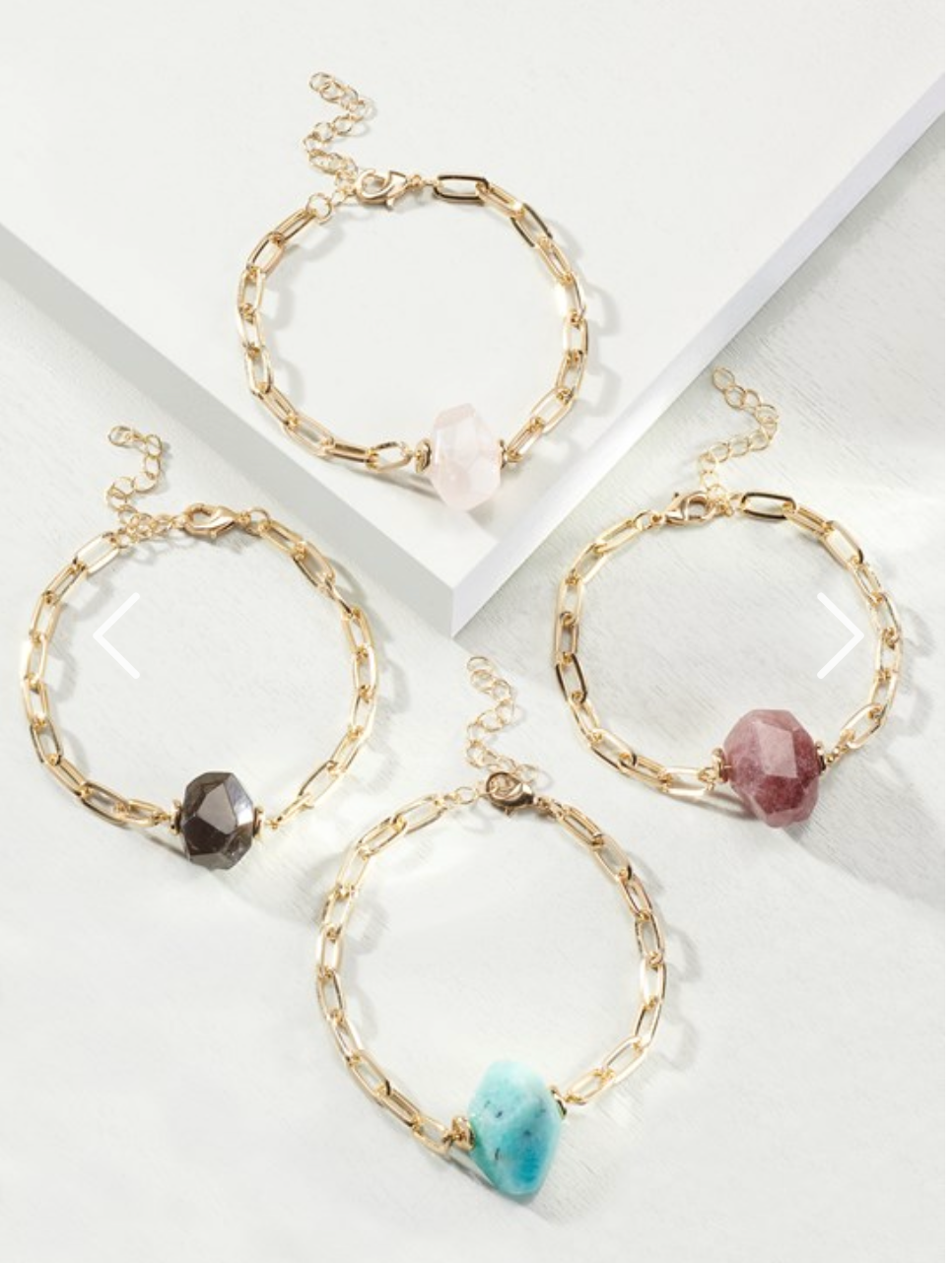 7in. paperclip chain bracelet styled with semi-precious gemstone. 4 assorted designs: Rose Quartz, Amazonite, Labradorite, Strawberry Quartz. Features a lobster clasp closure. 3in. extender. Gold finish. 80% Glass, 20% Metal.