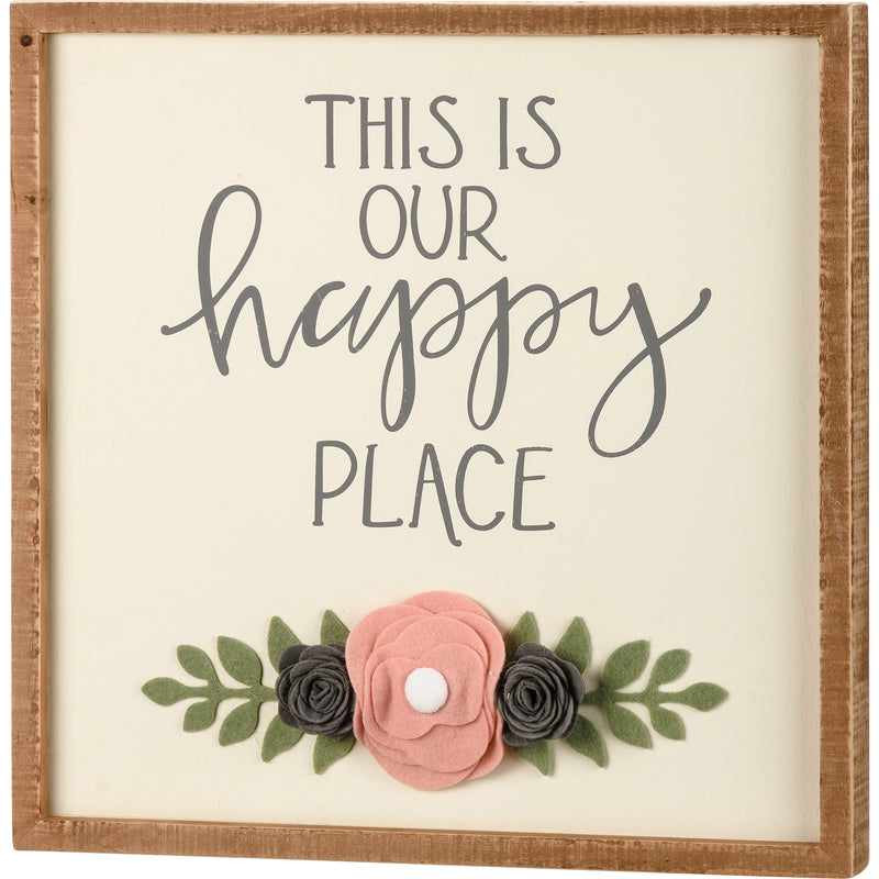 An inset wooden box sign featuring a hand lettered "This Is Our Happy Place" sentiment, felt floral addition, and natural wood sides for added interest. Our This Is Our Happy Place inset wooden box sign is easy to hang or can free-stand alone.