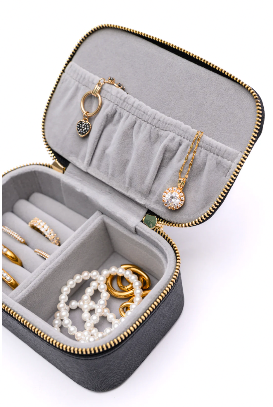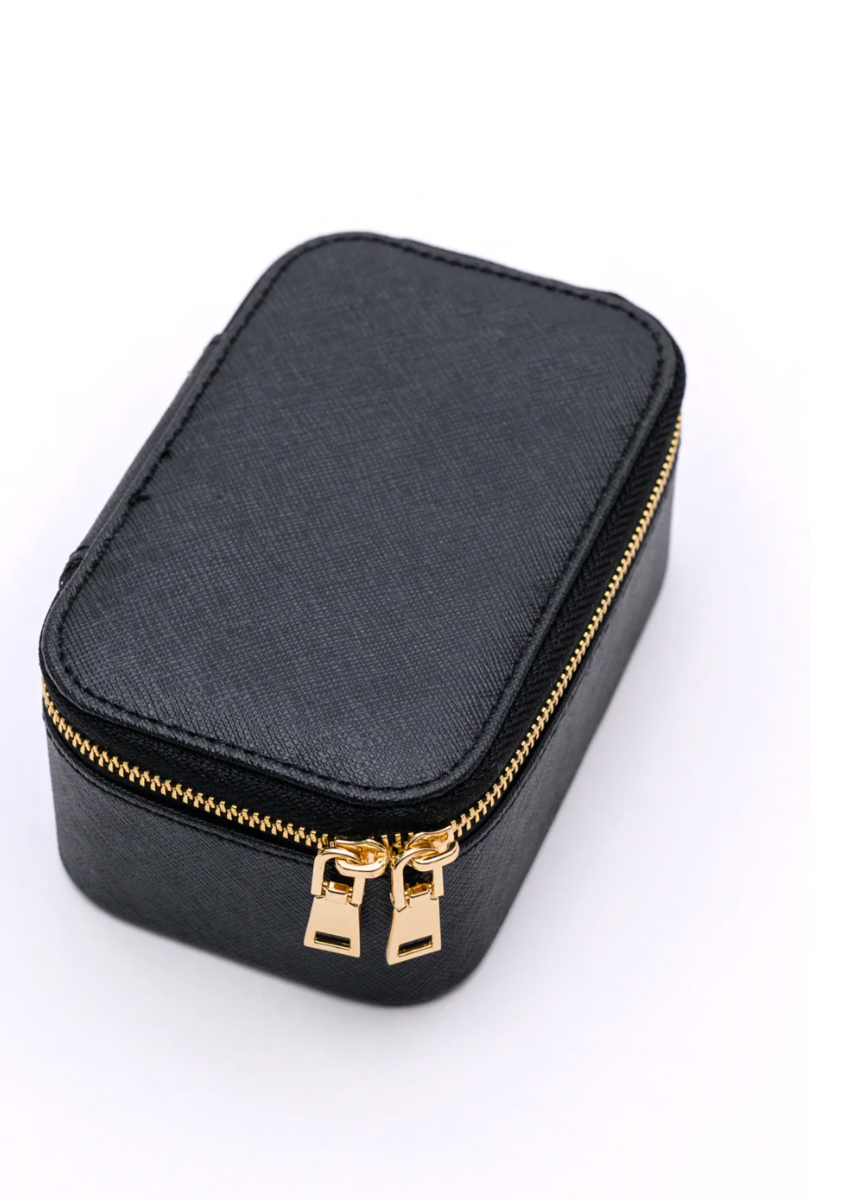 Stay organized while traveling with our Travel Jewelry Case in Black! The pebbled vegan leather outer is lined with velvet to protect your jewelry. It features 5 ring slots, a large compartment for bracelets and larger pieces, and an elasticated pouch for earrings and small pieces. Keep your valuables safe with the convenient zippered closure.