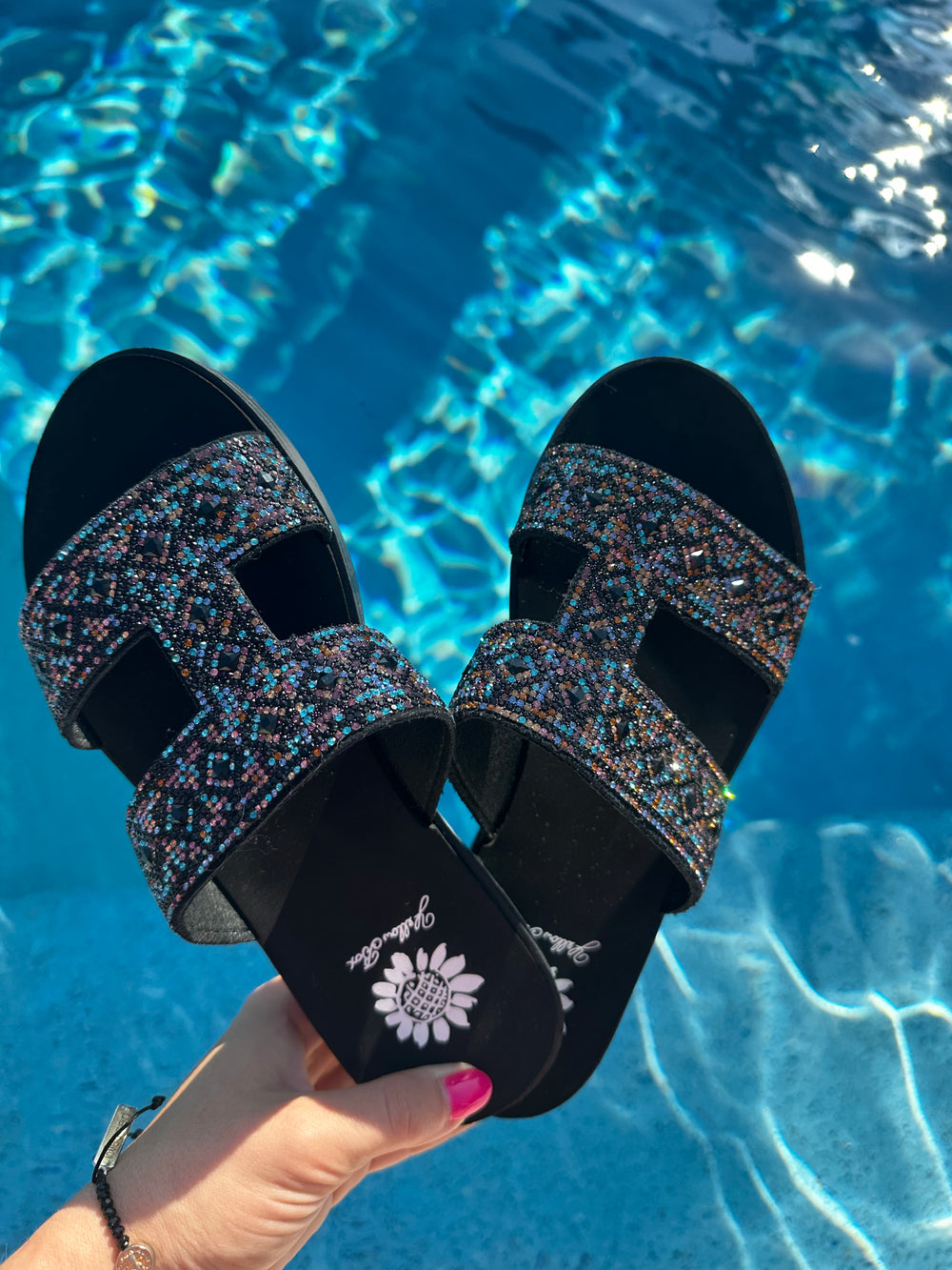 Up the wattage and shine in this H-band style sandal bedazzled with multicolor rhinestone mixes.